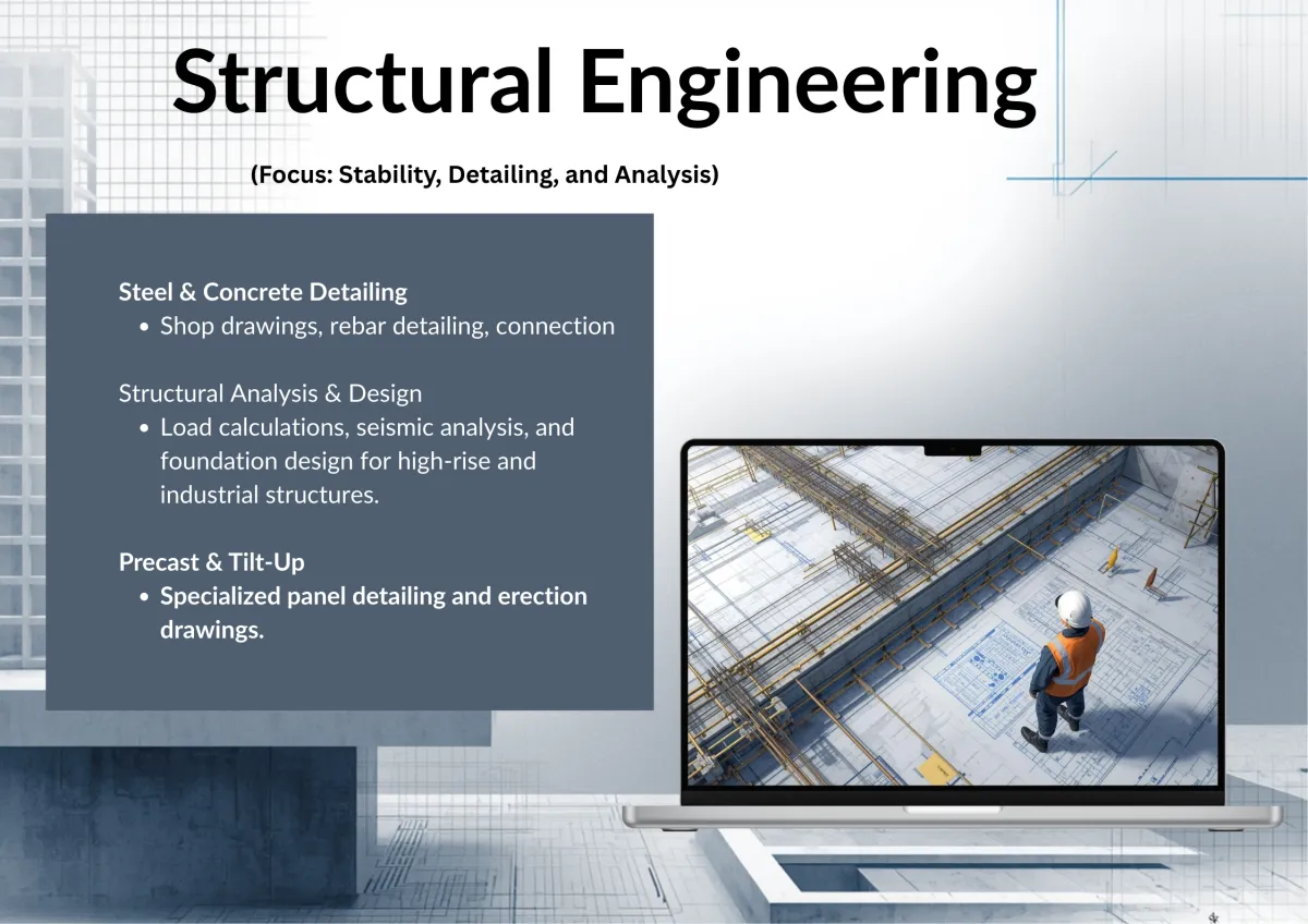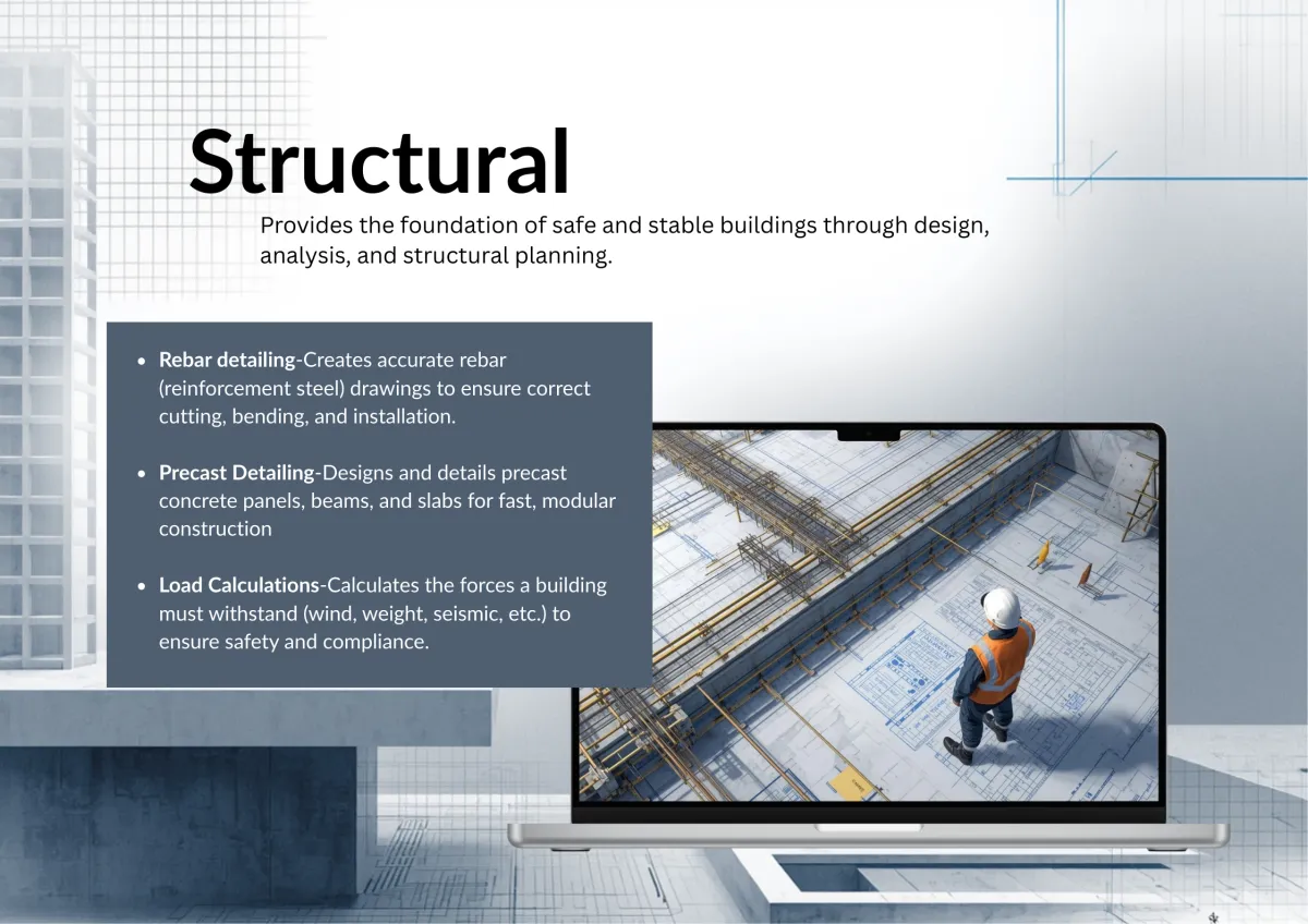 Rebar detailing, precast detailing, and load calculations for safe, code-compliant structures.